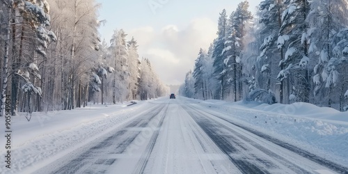 Beautiful long snow highway view in cold weather. AI generation.