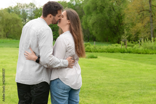 Beautiful loving happy couple kissing in park on spring day
