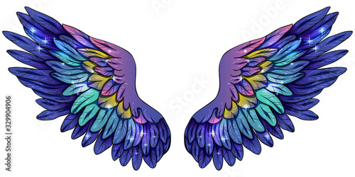 Beautiful magic gradient glowing shiny violet wings with green, yellow and pink feathers, vector