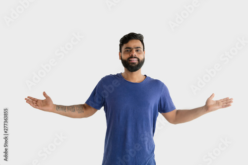 Beautiful male half-length portrait isolated on white studio background. Young emotional hindu man in blue shirt. Facial expression, human emotions, advertising concept. Presenting and inviting.