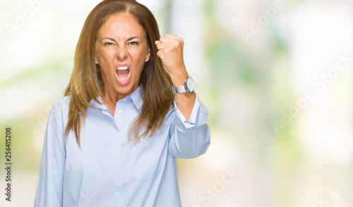 Beautiful middle age business adult woman over isolated background angry and mad raising fist frustrated and furious while shouting with anger. Rage and aggressive concept.