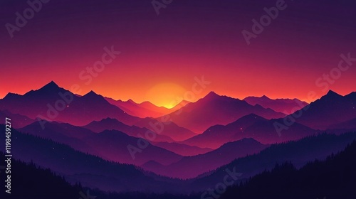 Beautiful minimalist illustration of a sunset over mountains, perfect for tranquil themes in travel, nature retreats, or relaxation promotions.