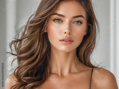 Beautiful model girl with short hair. Beauty brunette woman with brunette curly hairstyle. Fashion portrait closeup clean skin, facial and cosmetics and makeup concept. Gorgeous female. AI generated