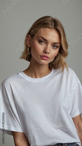 Beautiful model in oversized white t-shirt. Fashion and lifestyle concept. Urban style idea. Copy space.