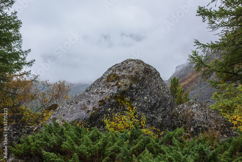 mountain, autumn, rock, stone, moss, lichen, tree, shrub, bush, coppice, vegetation, flora, forest, green, yellow, leaf, foliage, landscape, low cloud, fog, mist, dense, thick, cloudy, sky, cloudiness, weather, cloud, foggy, misty, top, peak, range, snow, scenery, view, scenic, colourful, dramatic, atmospheric, beautiful, alpine, highland, nature, background, mountain, autumn color, altai