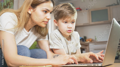 Beautiful mother working from home with her son. Independent focused mom and child studying behind computer. Home education and work concept.