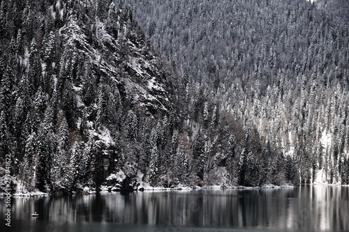 Beautiful mountain Lake Ritsa. Lake Ritsa in the Caucasus Mountains, in the north-western part of Abkhazia, Georgia, surrounded by mixed mountain forests and subalpine meadows. Snow in mountains
