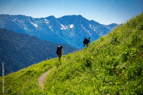 Beautiful mountain landscape with tourists hiking at Caucasus mountains.
