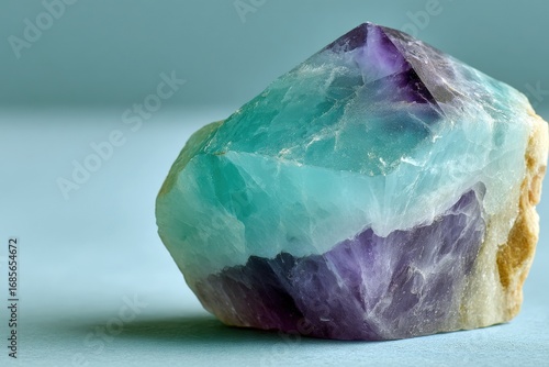 Beautiful multicolored crystal with green and purple hues resting on a light blue surface