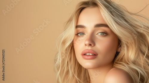 beautiful natural blond young woman, studio shot, pastel beige background, commercial photography, luscious hair, copy space