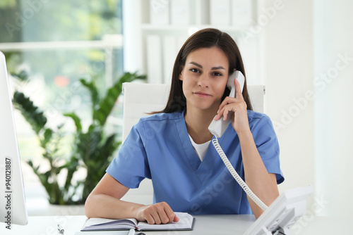 Beautiful nurse working with clients by telephone at table in hospital office