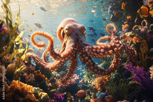 beautiful octopus swimming gracefully in underwater scene filled with vibrant coral reefs and colorful fish, showcasing wonders of marine life and beauty of ocean