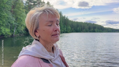 Beautiful old woman dreaming and meditation outdoors near lake in nature
