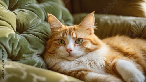 Beautiful orange and white female striped tabby kitten. Reclining on sofa with orange and green cushions. Head facing to the side.