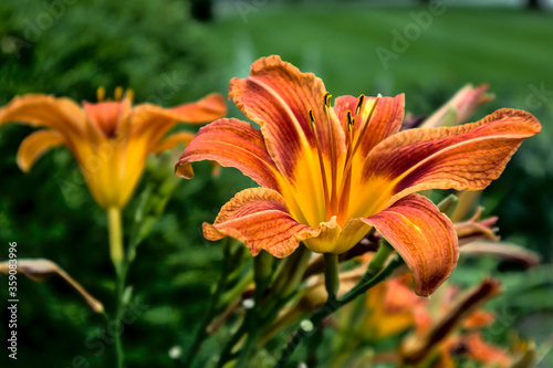 Beautiful Orange and Yellow daylily flowers with green backdrop