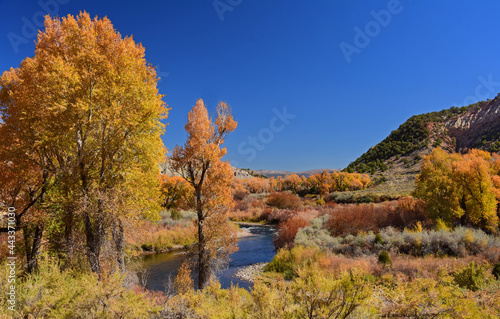 autumn, autumn color, beautiful, blue skies, colorado, colourful, eagle, fall, autumn color, fall leaf, foliage, forest, hillside, landscape, mountain, orange, river, river bank, rocky mountain, shrub, sunny day, tree, water