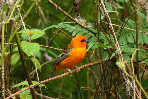 Beautiful orange bird or madagascar weaver sitting on a branch in the tropical jungle of Madagascar