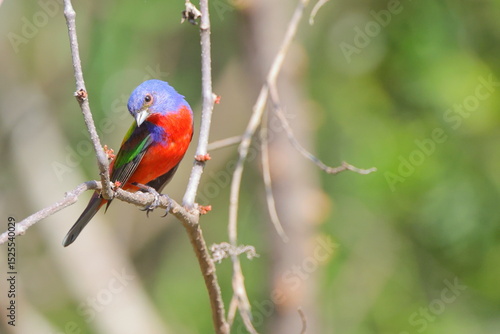 Beautiful painted bunty, perched in habitat against a blurry background.