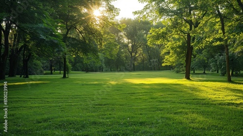 beautiful park with a meadow and wooded area at sunrise in high resolution and quality