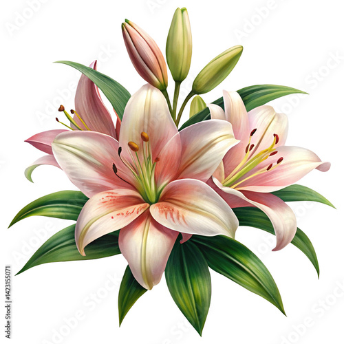 Beautiful pastel lily blossoms and buds with vibrant green leaves against white