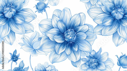 beautiful pattern featuring large blue flowers with intricate details against white background, evoking sense of tranquility and elegance