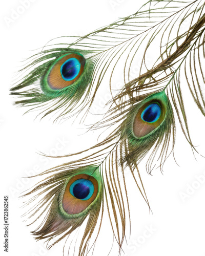 Beautiful peacock feathers with vibrant colors and intricate patterns create stunning visual display. iridescent eyespots add touch of elegance