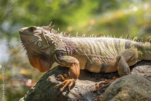 Beautiful photo of a cute green iguana with orange spots, sitting on a stone, and looking into the distance, by the pond, Colombia