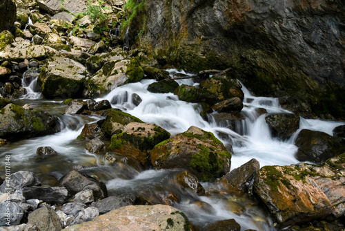 Beautiful photo of rapids and small waterfalls between big moss covered rocks.