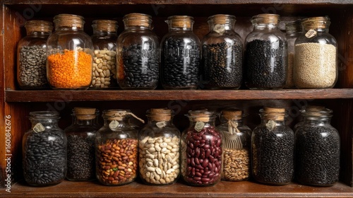 Beautiful photo of variety of Dried Beans in Black Jars on Wooden Shelf.