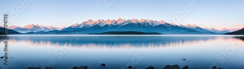 Beautiful picturesque landscape of a mountain range at dawn. The mountain peaks are covered with snow. Generative AI.