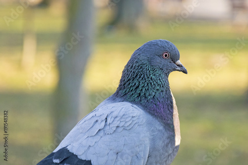 Beautiful pigeon portrait, dove in park or forest. Grey bird outdoors.