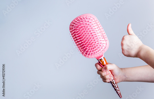 Beautiful pink comb brush in the hand of girl with thumb up on white background
