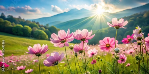 Beautiful pink flowers with soft petals and delicate stems in a lush green meadow, surrounded by gentle hills and sunny skies, wildflowers , blossoms