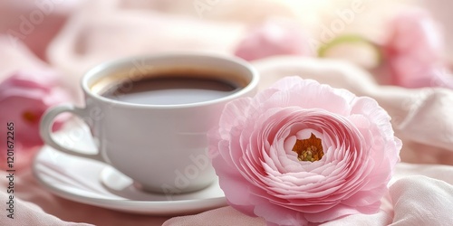 Beautiful pink Persian buttercup alongside a cozy cup of coffee, creating a delightful setting that highlights the charm of pink Persian buttercup and the warmth of coffee.
