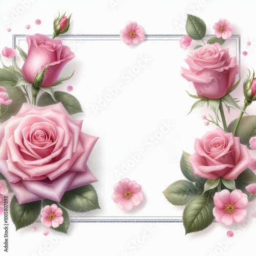 Beautiful pink roses and delicate flowers frame a blank space, perfect for invitations.