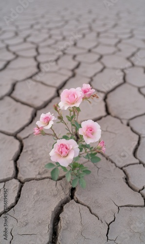 Beautiful pink roses bloom from cracked dry earth, symbolizing resilience amidst harsh conditions in an arid landscape
