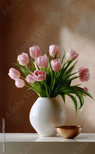 Beautiful Pink Tulips Arranged in a White Vase on a Simple Table With a Decorative Golden Bowl
