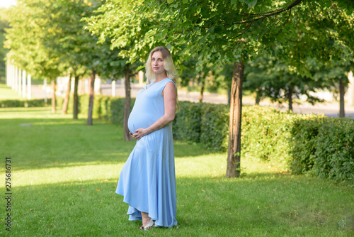 Beautiful portrait of a pregnant woman on a warm summer day in the nature. Pregnancy and season concept