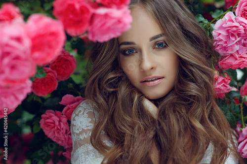 Beautiful portrait of a woman in poses. A brunette woman is standing next to roses in nature. High quality photo.