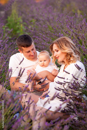 Beautiful portrait of a young family with baby in lavender field. Family love and value concept.
