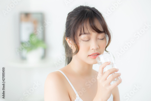Beautiful portrait young asian woman caucasian smiling with nutrition thirsty and drinking glass of water mineral with fresh and happy, asia girl diet for healthy care and wellness, lifestyle concept.