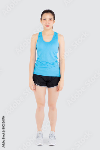Beautiful portrait young asian woman in sport clothes with satisfied and confident isolated on white background, asia girl cheerful have shape and wellness, exercise for fit with health concept.
