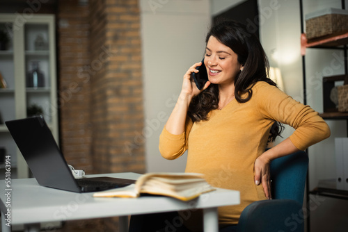 Beautiful pregnant woman working on laptop. Young businesswoman talking to the phone..