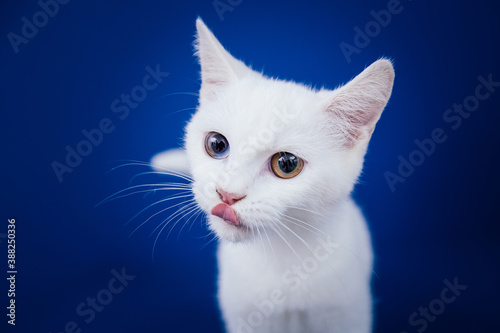 Beautiful pure white cat with one blue and one brown eye posing against blue background in studio.
