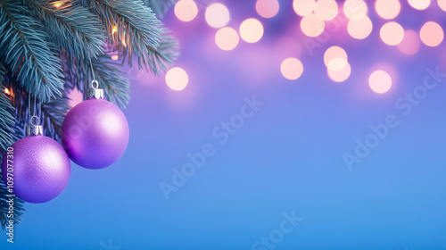 Beautiful purple ornaments hanging from a Christmas tree with soft bokeh lights in the background
