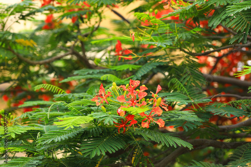 beautiful red blooming flowers delonix with green leaves