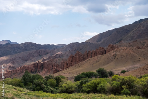 Beautiful red clay mountains eroded on wind. Red mountains or red canyon on the way from Assy plateau to Bartogai reservoir. Mountain canyon landscape.