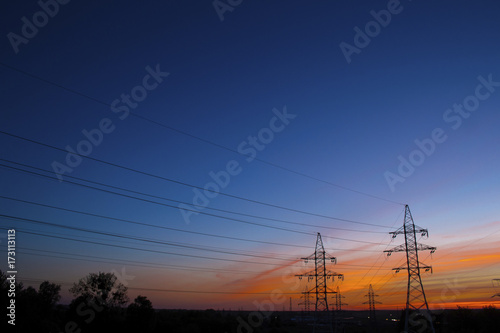 background, beautiful, cable, cloud, electric, electrical, electricity, energy, equipment, evening, high, horizon, industry, line, orange, power, pylon, red, silhouette, sky, steel, structure, sun, sunset, supply, technology, tower, transmission, voltage