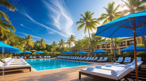 Beautiful resort pool area with sunbeds, umbrellas, and palm trees, blue sky overhead, peaceful holiday atmosphere