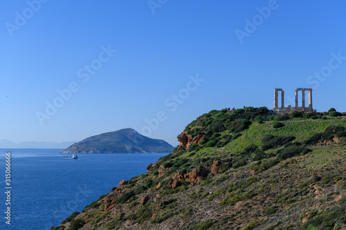 Beautiful rocky coastline and temple of Poseidon on Cape Sounion